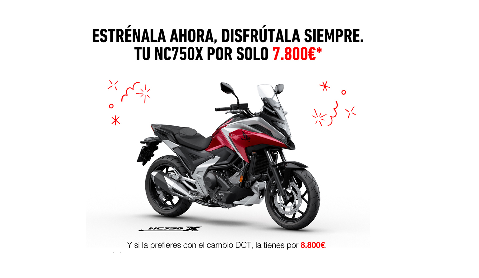 Promoción válida solo para unidades en stock de NC750X y NC750X DCT 2023 y 2024 matriculadas hasta el día 30/04/2026 al contratar HONDA PLUS.